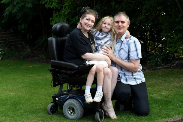 Femeia a rămas paralizată pe partea stângă și se află într-un scaun cu rotile, dar este fericită că trăiește și duce o viață frumoasă alături de familia sa.