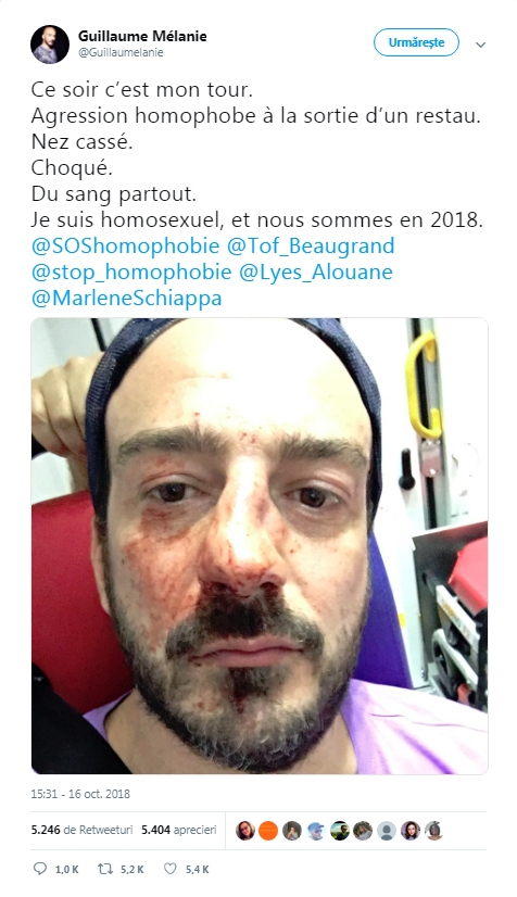 Guillaume Melanie, șeful asociației Urgence Homophobie care-i ajută pe cei ce cad victimă violenţei faţă de persoanele LGBT, a postat pe Twitter un mesaj în care afirmă că a fost atacat în timp ce pleca dintr-un restaurant cu un grup de activiști.