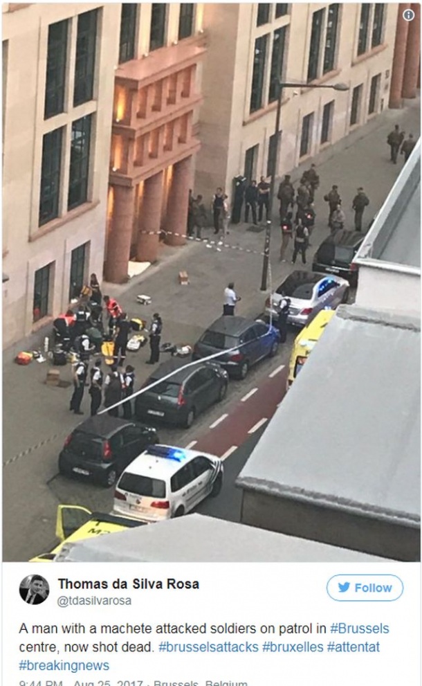 Un bărbat înarmat cu un cuțit a atacat doi soldați din Bruxelles, conform polițiștilor care au securizat și evacuat zona. Atacatorul a fost împușcat mortal pe bulevardul Emile-Jacqmain, în jurul orei locale 8:20 pm.