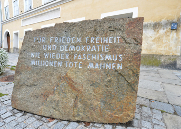 Casa natală a lui Hitler este în centrul orașului Braunau am Inn, iar pe o placă de la intrare scrie: "Pentru pace, libertate și democrație. Niciodată fascism: milioane de morți ne avertizează".