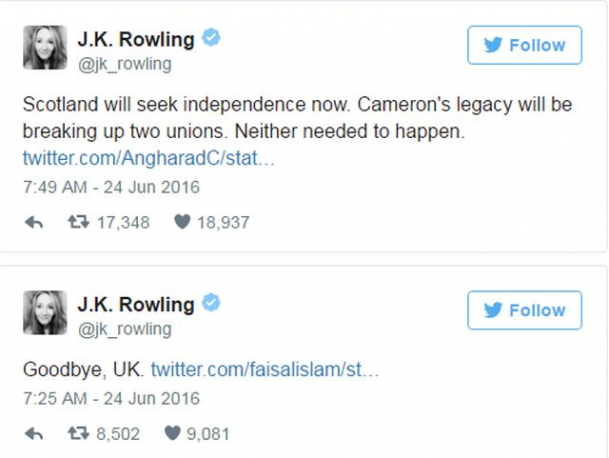 J.K. Rowling, autoarea trilogiei "Harry Potter" a reacționat pe Twitterdupă ce tabăra "leave" a câștigat referendumul din Marea Britanie. Aceasta și-a exprimat dezamăgirea față de rezultatul referendumului: „Nu cred că mi-am dorit vreodată mai mult ca acum să se întâmple o minune”.