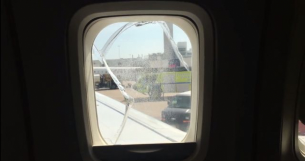 Imagini publicate pe Twitter arată un geam spart în dreptul locurilor destinate pasagerilor, în zona de deasupra uneia dintre aripile avionului.