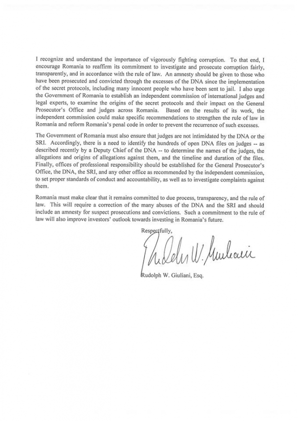 Iata şi textul în engleză al scrisorii emise de Rudolph Giuliani: