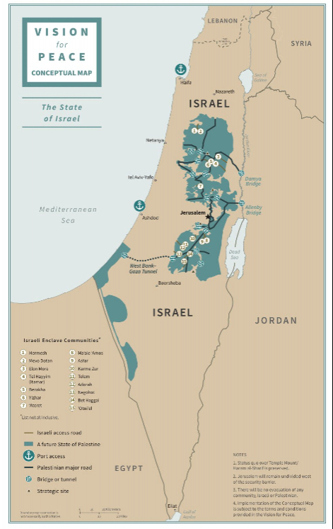 - „Dublarea”teritoriului palestinian şi formarea unei capitale palestiniene în estul Ierusalimului în care Statele Unite îşi va crea o ambasadă;