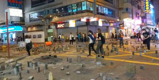 Foto: Pietre puse de protestatarii din Hong Kong în mijlocul străzii pentru a împiedica avansarea forţelor de ordine (sursă foto: Twitter / @HongKongFP)
