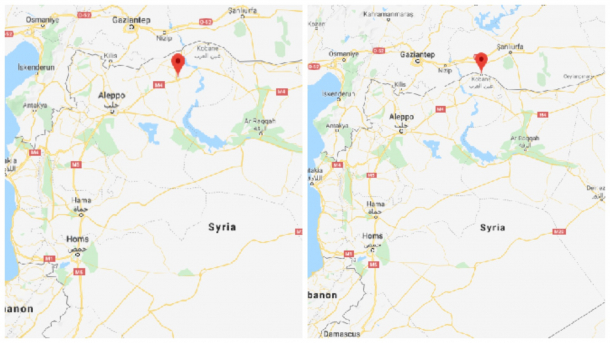 Foto: Localitățile Manbij (stânga) şi Kobane, în care au fost desfășurate trupe rusești (sursă foto: Google Maps)