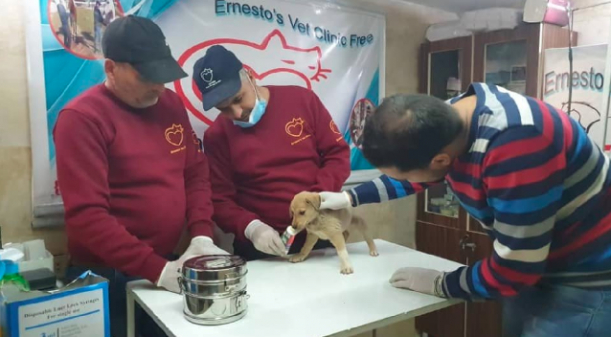Foto: Momentul în care cățelul „Bobe” este vaccinat (sursă foto: Twitter / @Josiensor)
