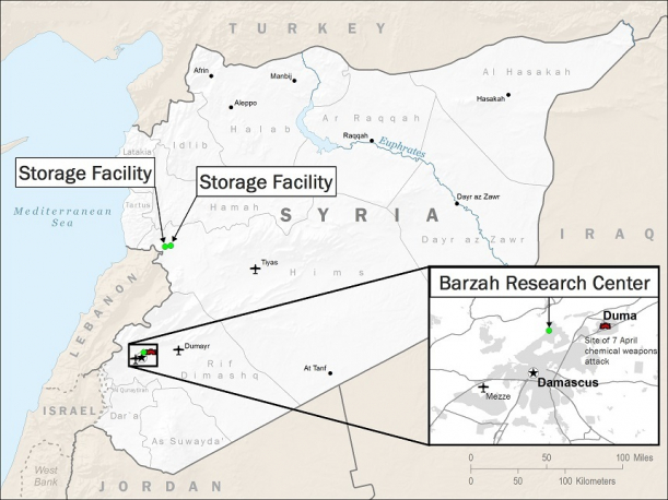 Cele trei ţinte lovite au fost:un centru de cercetare din Damasc despre care se crede că ar avea legătură cu producţia de arme chimice şi biologice, un depozit de arme chimice la vest de Homs şi un depozit de echipamente pentru atmele chimice şi un important centru de comandă tot de lângă Homs.