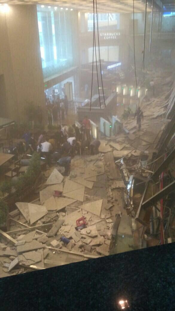Corespondentul Business Insider, Adam Harvey a transmis că tavanul holului s-a prăbuşit peste recepţie, unde este situată o cafenea Starbucks. Un angajat al Băncii Mondiale, care are biroul în aceeaşi clădire, a spus pentru BBC că nivelul mezanin s-a prăbuşit, iar un alt angajat de la etajul 23 a spus că a simţit clădirea clătinându-se după ce a auzit un zgomot puternic.