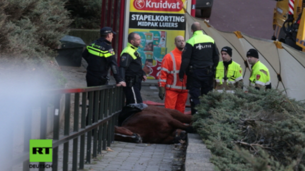 Calul a murit la datorie, prăbușindu-se în timpul protestelor care au avut loc luni în Nijmegen, Olanda. Și polițistul care îl conducea a suferit răni ușoare.