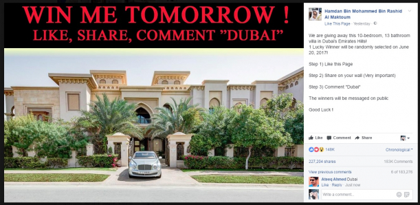 Mare concurs mare lansat sâmbătăpe Facebook de Prințul moștenitor Hamdan Bin Mohammed Bin Rashid Al Maktoum care oferă prin tragere la sorți un adevărat palat în Dubai.