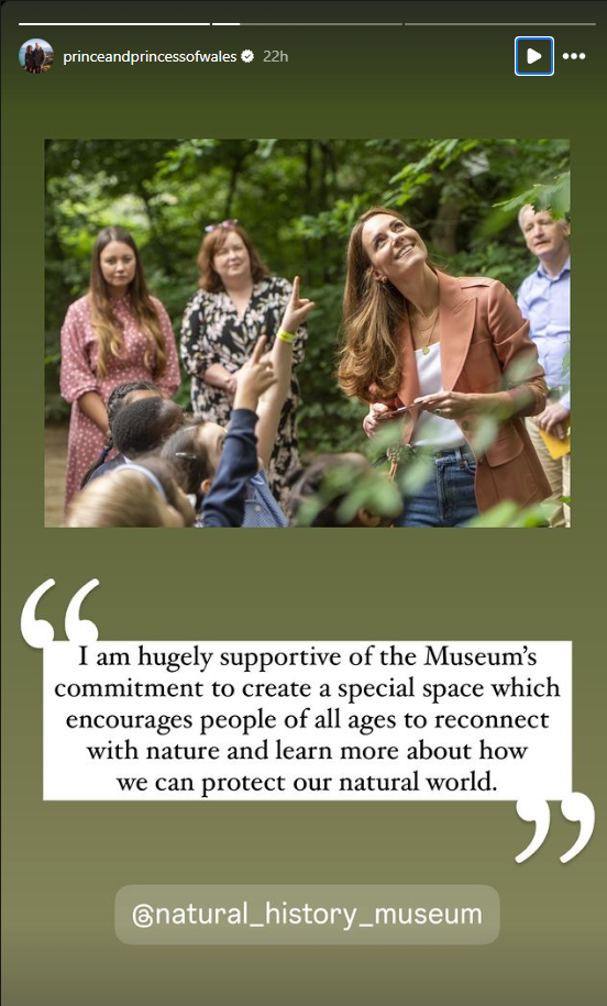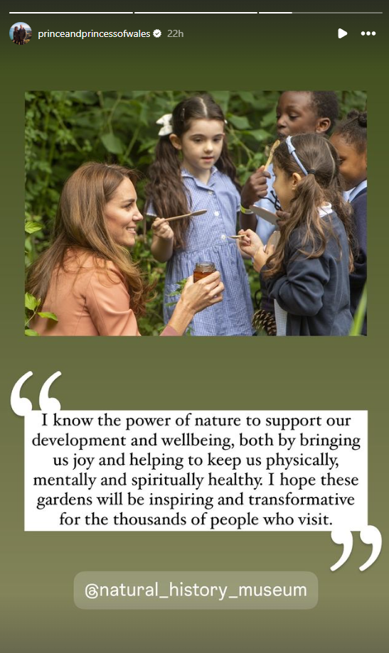 Kate Middleton a transmis un mesaj pe contul comun de Instagram, pe care îl are împreună cu soțul ei, William. Mesajul a fost publicat la sețiunea Instagram Stories, unde a vorbit despre puterea „transformatoare” a naturii, și despre capacitatea acesteia de a „ne susține dezvoltarea și starea de bine”.