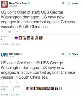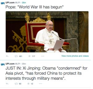 Potrivit unui mesaj apărut pe contul agenţiei de presă United Press International (UPI), Papa ar fi afirmat că „al Treilea Război Mondial a început”, în timp ce contul cotidianului New York Post informa că portavionul USS George Washington a fost vizat de rachetele chineze.