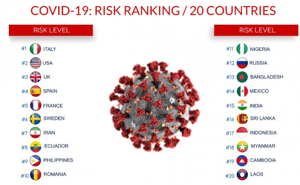 Pe primul loc în clasamentul negativ se află Italia, a treia țară din lume ca număr al infectărilor cu noul coronavirus și a doua la nivel mondial din punctul de vedere al deceselor în rândul pacienților contaminați cu SARS-CoV-2. Aceasta este urmată de Statele Unite, cea mai afectată țară din lume, atât ca număr al cazurilor de contaminare, cât și al deceselor. Top zece este completat în continuare de Marea Britanie, Spania, Franța, Suedia, Iran, Ecuador, Filipine și România.
