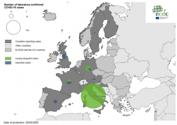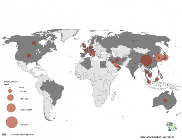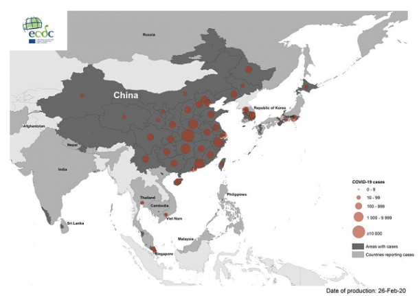 Noi cazuri au fost raportate în Norvegia, Elveţia, Danemarca, Pakistan, Macedonia de Nord, Georgia, Estonia şi România. În afara Chinei, cele mai rapide răspândiri ale coronavirusului au avut loc în Coreea de Sud (1.595 de cazuri raportate), Japonia (189 de cazuri) şi Italia (470 de cazuri raportate). În cazul acesteia din urmă, evoluţia este foarte rapidă ţinând cont că pe 18 februarie erau raportate doar trei cazuri de infectări.