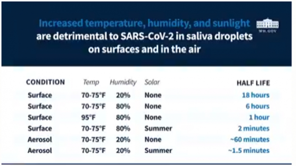 Un oficial de rang înalt al departamentului pentru Securitate internă, Bill Bryan, a declarat că razele soarelui au un efect mare de distrugere a virusului, atât pe suprafețe cât și în aer.