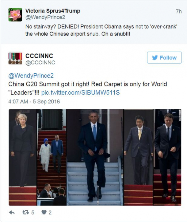 Autoritățile chineze nu au folosit covorul roșu la sosirea președintelui american Barack Obama și nici măcar nu au pus la dispoziție scara pentru coborâre din aeronavă pe ușa principală, dupăcum a scris New York Post. Astfel, liderul de la Casa Albă a fost nevoit să coboare pe o ușă a avionului dotată cu scară.