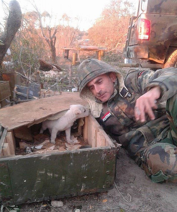 Imaginea zilei din războiul din Siria surprinde un militar din armata siriană, într-un moment de odihnă, alături de un pui de câine. Fotografia a devenit virală pe reţelele de socializare.