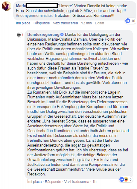O tânără româncă a ținut să transmită Guvernului german, printr-un comentariu la această postare, că Viorica Dăncilă nu este deloc o femeie puternică, ba chiar e cea mai slabă, indiferent dacă e 8 Martie sau orice altă zi. ”#nuepremierulmeu Totuși, salutări din România!”, a mai scris Maria, pe pagina de Facebook a Guvernului german.