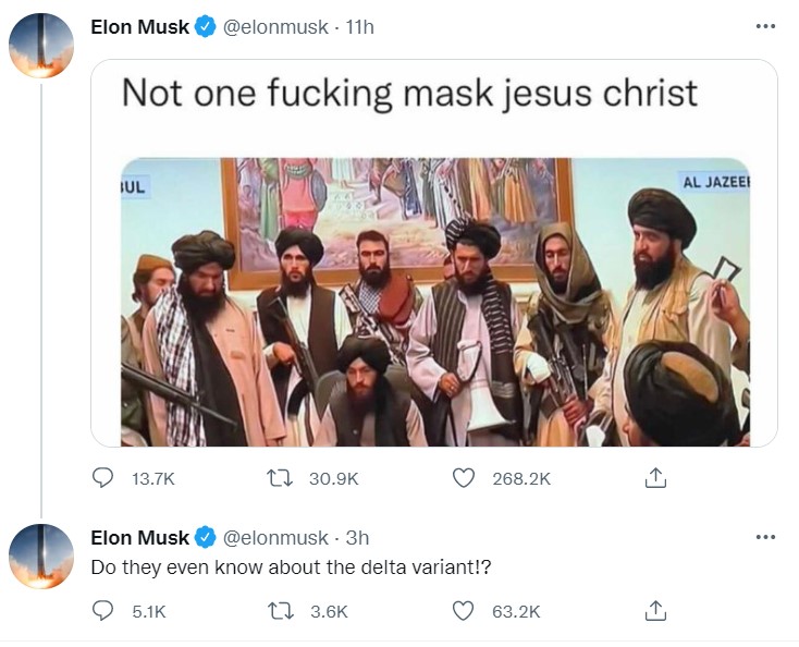 Musk a postat pe Twitter o fotografie a grupului militar cu mesajul „Nici măcar o mască, Isuse Hristoase. Oare au aflat despre noua variantă Delta?”.