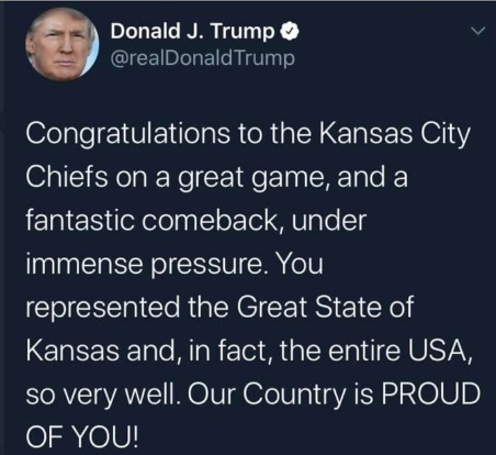 Donald Trump a ținut să felicite statul Kansas pentru victoria echipei Kansas City Chiefs în Super Bowl, finala ligii profesioniste de fotbal american NFL. Numai că orașul se află, de fapt, în Missouri.