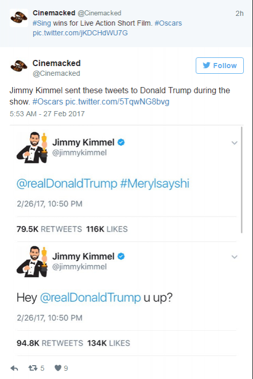 De asemenea, Jimmy Kimmel a subliniat faptul că deși trecuseră două ore de la începerea evenimentului, Donald Trump nu a spus absolut nimic legat de acest subiect. Kimmel a rugat producătorii să îi afișeze numărul de telefon pe ecran în caz că liderul SUA are de gând să-l sune în direct. ”Au trecut două ore din ceremonie și Donald Trump nu a scris încă nimic despre noi. (…). Donald Trump, te-ai trezit?”, a mai spus comediantul. Kimmel i-a adresat aceste mesaje lui Trump și prin intermediul contului său de Twitter.