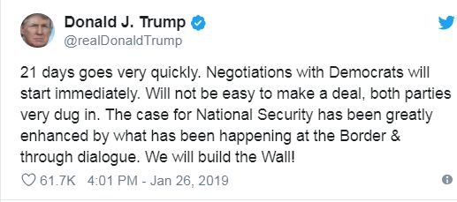 „21 de zile trec foarte repede. Negocierile cu democrații vor începe imediat. Nu va fi ușor să încheiem o înțelegere, ambele părți fiind foarte vehemente. Cazul pentru Securitatea Națională a fost mult îmbunătățit de ceea ce se întâmplă la graniță și prin dialog. Vom construi Zidul!”, a fost mesajul președintelui Trump.