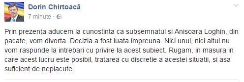 Primarul din Chișinău anunța în postarea respectivă că el și Anișoara Loghin urmează să divorțeze și nu vor să discute nimic mai mult pe acest subiect.