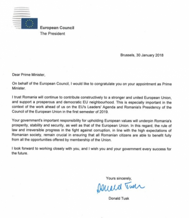 "În numele Consiliului European, aș dori să vă felicit pentru numirea dumneavoastră în funcția de prim-ministru. Am încredere că România va continua să contribuie constructiv la o Uniune Europeană mai puternică și unită și să sprijine o vecinătate prosperă și democratică a UE.