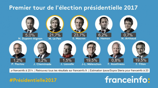 Centristul independent Emmanuel Macron și Marine Le Pen, din partea Frontului Național, sunt candidații care s-au clasat pe primele două locuri în urma primului tur de scrutin de la alegerile prezidențiale din Franța, potrivit exit poll-urilor.