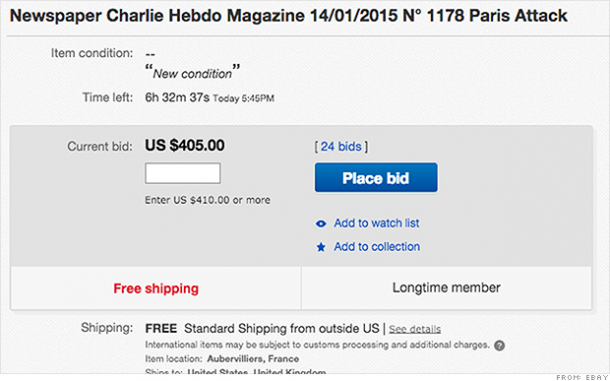Mai multe copii ale revistei Charlie Hebdo apărută miercuri pe piață au fost vândute cu 600 de dolari pe eBay, în timp ce multe alte licitații sunt în desfășurare, scrie cnn.com.