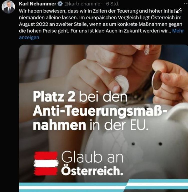 Partidul cancelarului austriac, Karl Nehammer, ÖVP, și-a lansat campania „Să crezi în Austria” pe X, fostul Twitter, cu o fotografie rusească care arată ruble – postarea a fost eliminată de atunci, scrie derstandard.