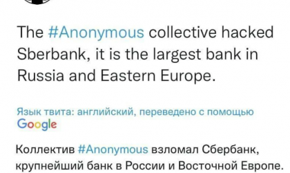 „Anonymous a piratat Sberbank, cea mai mare bancă din Rusia și Europa de Est”, se arată într-o notă pe pagina oficială de Twitter a hackerilor.