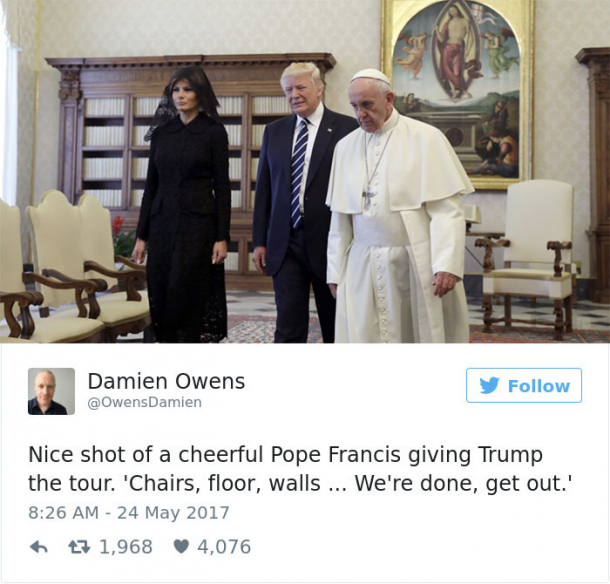 Imaginile din timpul vizitei președintelui american Donald Trump la Vatican au devenit virale în mediul online. Numeroase persoane au comentat mimica Papei Francisc. Suveranul Pontif apare în toate imaginile cu o privire foarte tristă, orientată în jos, semn că nu este încântat de invitatul pe care îl primește.