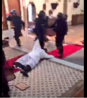 La un moment dat, agenții îl trag de maini și de picioare pe un preot, care s-a întins pe jos în biserica.