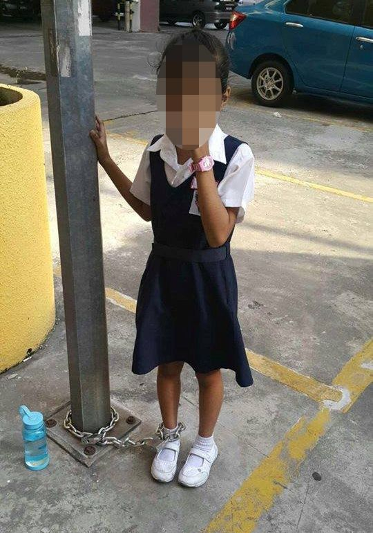 O fată de 8 ani din Kuala Lumpur, Malaezia, a fost legată cu lanțuri de un stâlp de către mama ei.