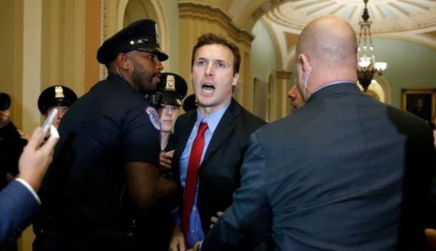 Donald Trump nu a părut afectat de incident şi şi-a continuat drumul pe culoarul Congresului. Forţele de ordine au intervenit şi l-au scos pe pe protestatar din clădirea Congresului.