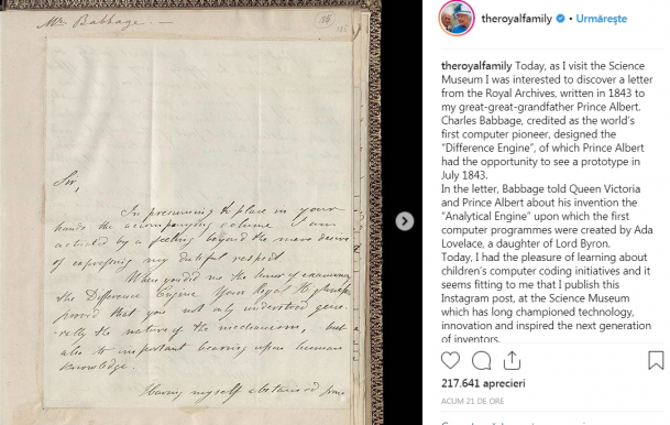 Postarea a fost făcută ca urmare a vizitei Regineila Muzeul de Științe din Londra, iar aceasta constă într-o poză cu o scrisoare trimisă unuia dintre înaintașii săi, Prințul Albert.![]()