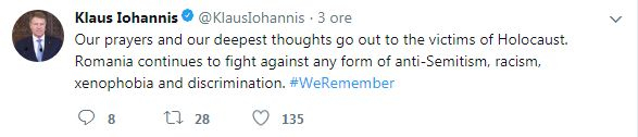 "Rugăciunile şi gândurile noastre cele mai profunde se îndreaptă către victimele Holocaustului. România continuă să lupte împotriva oricărei forme de antisemitism, rasism, xenofobie şi discriminare", a scris Klaus Iohannis pe Twitter.
