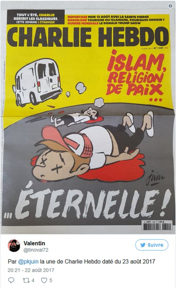 După atentatul terorist de la Barcelona în care au murit 15 persoane și aproximativ 150 de răniți, Charlie Hebdo ironizează din nou religia islamică.