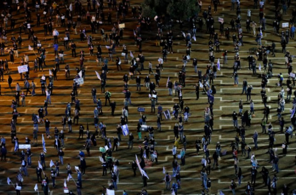 Mai bine de 2000 de israelieni au protestat împotriva restrânegerii libertăților, duminică, în Piața Rabin din Tel Aviv, păstrând o distanță de 2 metri, unii față de ceilalți.