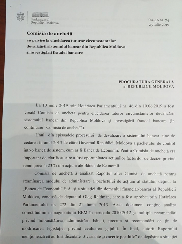Pe 10 iunie, în cadrul ședinței Legislativului de la Chișinău, deputații au constituit Comisia de anchetă pentru elucidarea tuturor circumstanțelor devalizării sistemului bancar. Din 24 iunie, au început audierile privind imensa fraudă bancară.