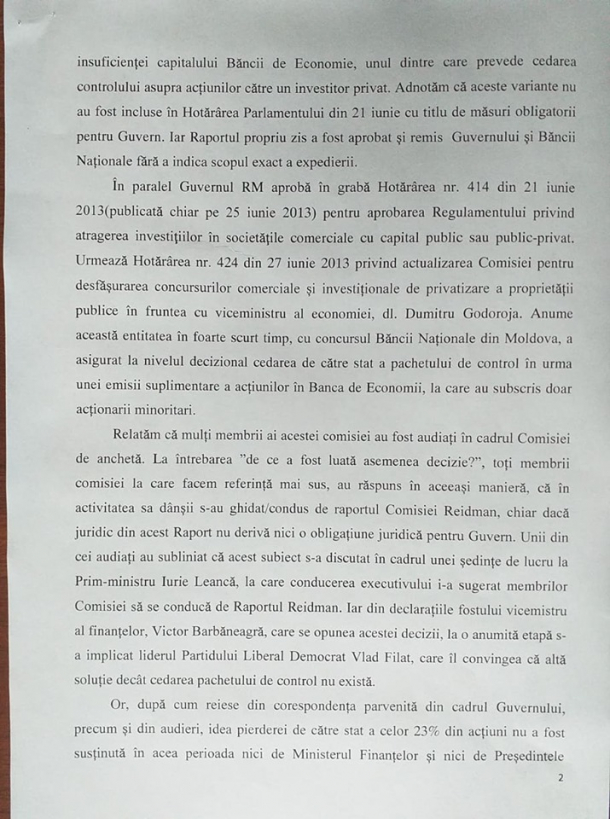 Membrii Comisei consideră că persoanele vizate, printre care și Iurie Leancă, au pus în aplicare procesul de deposedare a statului de pachetul de control la Banca de Economii și au dus la consecințe grave pentru sistemul bancar al Republicii Moldova.