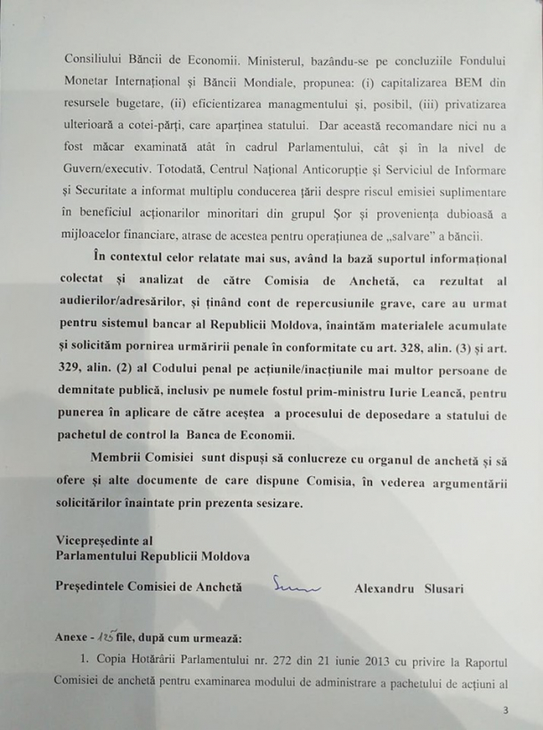 „Solicităm pornirea urmăririi penale în conformitate cu art. 328, alin. (3) și art. 329, alin. (2) al Codului penal pe acțiunile/inacțiunile mai multor persoane de demnitate publică, inclusiv pe numele fostul prim-ministru Iurie Leancă, pentru punerea în aplicare de către aceștea a procesului de deposedare a statului de pachetul de control la Banca de Economii, ținând cont de repercusiunile grave, care au urmat pentru sistemul bancar al Republicii Moldova”, a scris Slusari, pe pagina sa de Facebook.