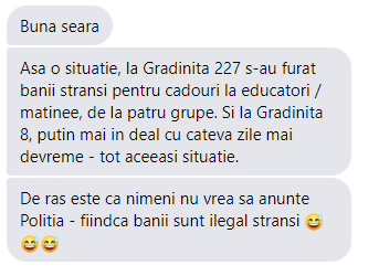 Pe un grup de pe rețelele de socializare mai mulți părinți au scris că aceste furturi au avut loc la două grădinițe și că acești bani ar fi fost strânși pentru matinee și cadouri la educatori.