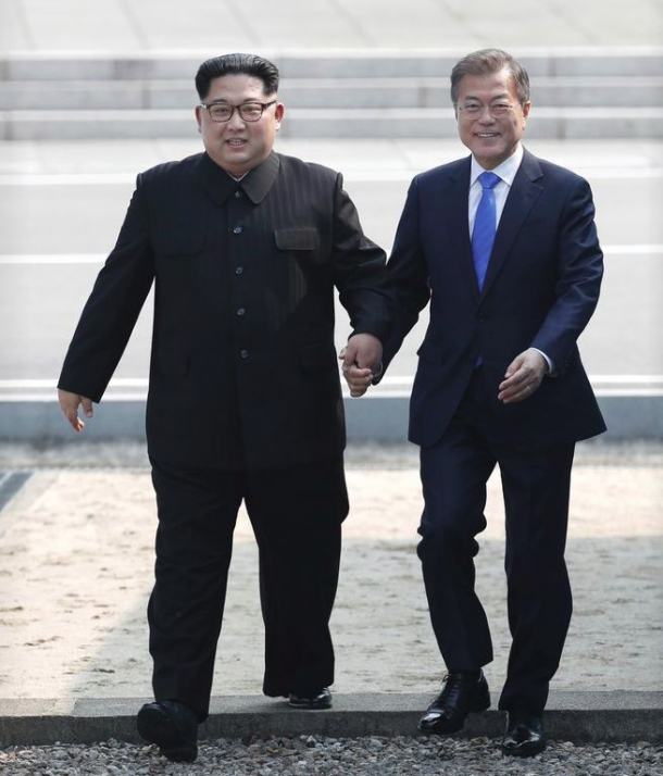 Kim Jong-un a fost așteptat de președintele sud-coreean, Moon Jae-In, la ora 09:30 (03:30, ora României), pe partea sud-coreeană a zonei demilitarizate, pășind peste linia de demarcație stabilită în 1953.