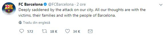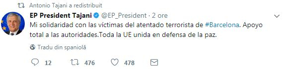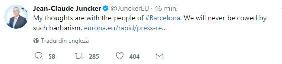 ”Gândurile mele sunt alături de oamenii din #Barcelona. Nu vom fi niciodată intimidați de un astfel de act de barbarism”, a transmis și președintele Comisiei Europene, Jean Claude Juncker.