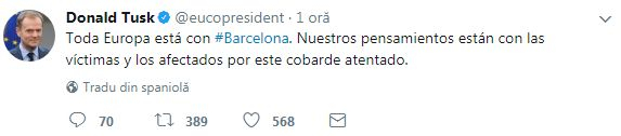 ”Toată Europa este alături de #Barcelona. Gândurile noastre se îndreaptă câtre victimele și toți cei afectați de acest atentat laș”, a scris Tusk pe Twitter.