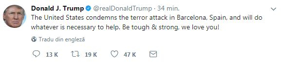 Președintele american Donald Trump a precizat pe Twitter că „Statele Unite condamnă atacul terorist din Barcelona, Spania, și vor face tot ceea ce este necesar pentru a ajuta”.