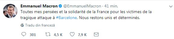 ”Toate gândurile mele și susținerea din partea Franței pentru victimele tragicului atac din #Barcelona. Rămânem uniți și determinați”, a fost mesajul liderului de la Paris.